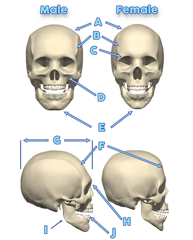 Most important skull differences between men and women are indicated by the letter value on the figure to the left and described below: