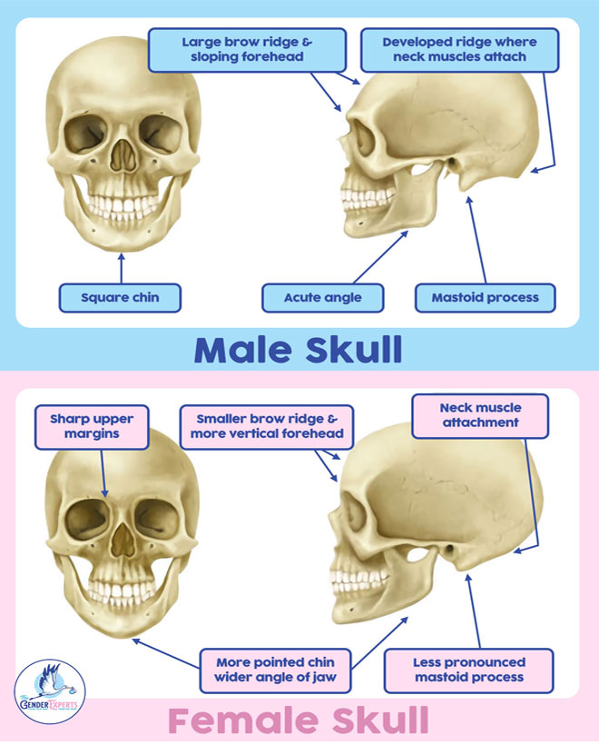- (D) The Zygomatic bone (the cheekbone that lies under the lower eye ridge) is more pronounced on the male skull.